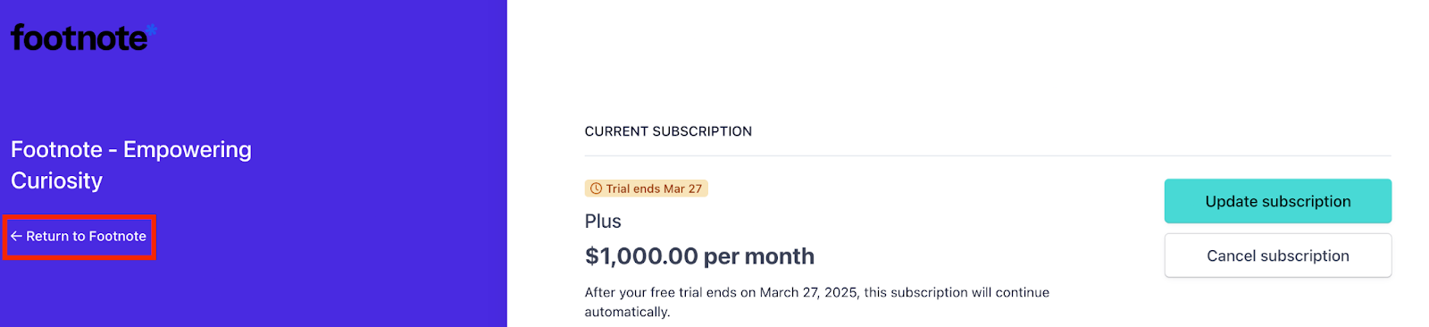 Access your Footnote > Stripe Dashboard (click the “Manage Subscription” button on the right-hand side of the screen)